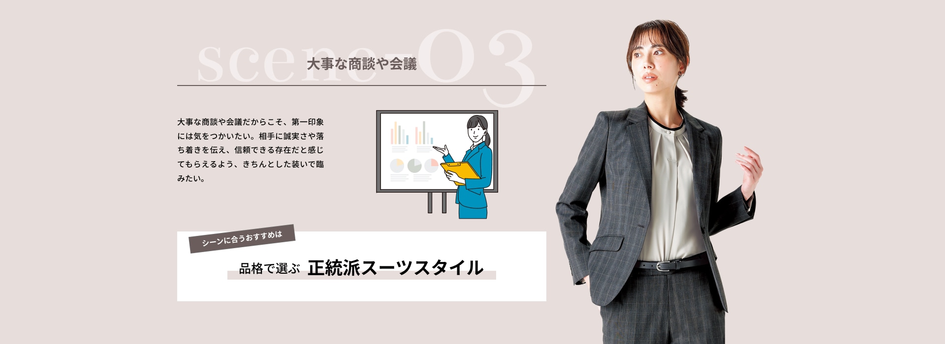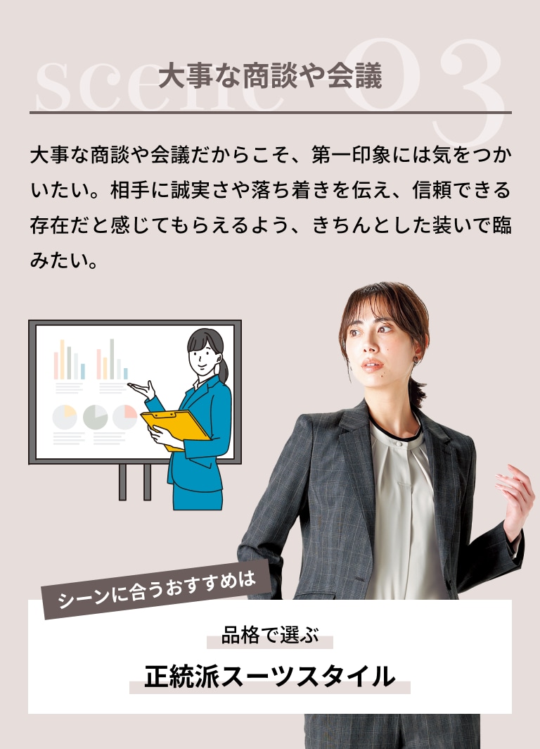 在給對方留下的印象很重要的商務場合,可以搭配正裝穿著。套裝是指上衣和裙子,或者褲子在共生地制成的上下一衹的衣服。裡面搭配簡單的女式襯衫,搭配淺口無扣無帶皮鞋,可以在很多場合穿著,給人以幹練的印象。