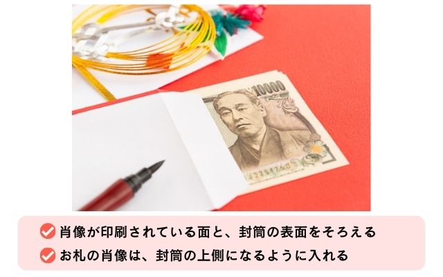 お札の表面である肖像が印刷されている面と封筒の表面をそろえて入れます。お札の肖像は封筒の上側になるように入れましょう。